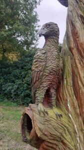 Un liquidambar vieux de 60 ans fait face à une très belle sculpture sur bois où sont perchés trois rapaces.